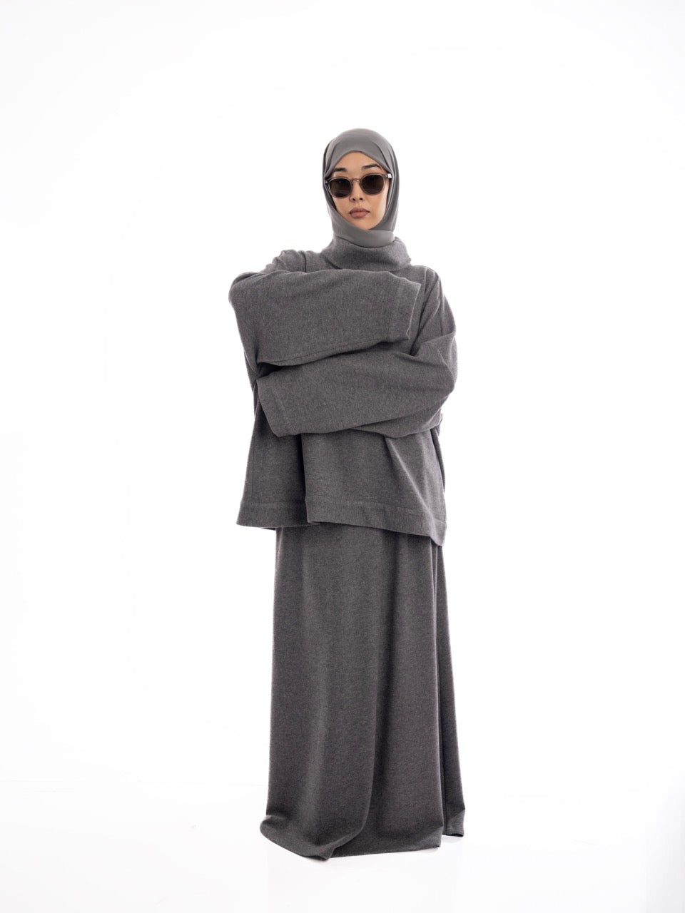 Ensemble composé d’un haut ample à coupe trapèze avec col montant et d’une jupe longue évasée fluide.